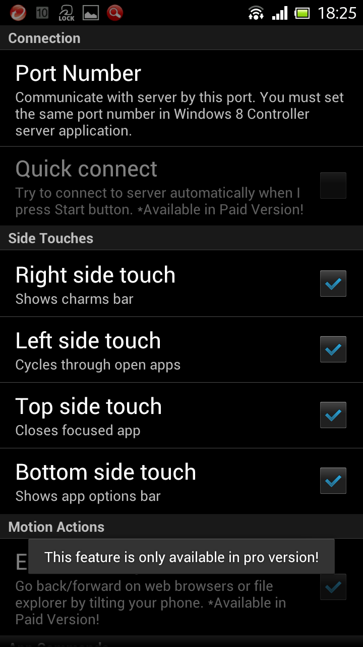 無料版は機能が制限されており、タッチ操作のみ可能といった感じですが、有料版のWindows 8 Controller Proはさまざまな操作ができるようショートカットボタンが用意されています。