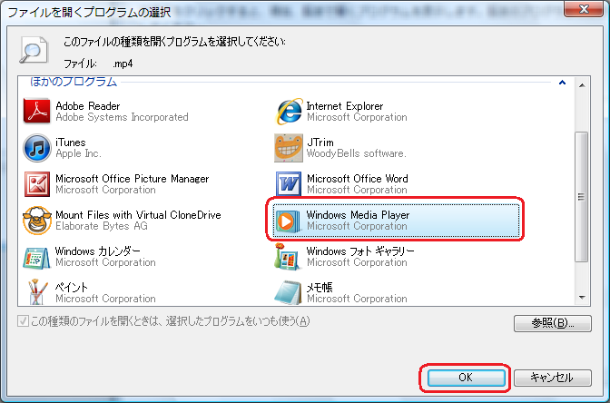 ここでは拡張子.mp4のファイルをWindows Media Player11に関連付けます。