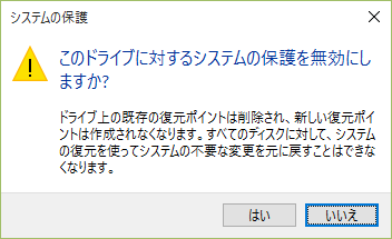 以下はCドライブのシステムの保護を有効から無効に変更にしようとした際のメッセージです。