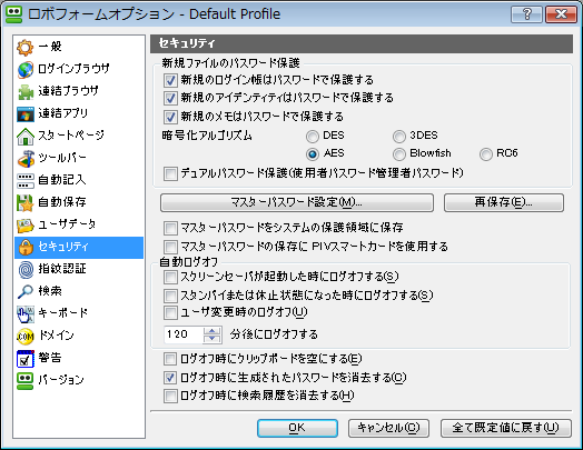 マスターパスワードや暗号化方式などセキュリティに関する設定です。