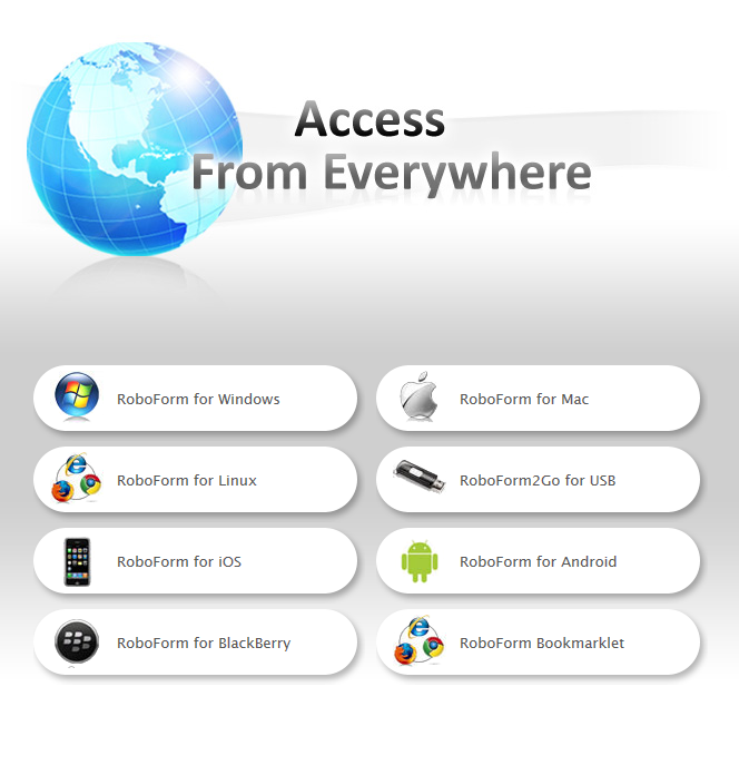 1.Roboform Everywhere:Roboformファミリすべてを利用可能で制限は1ライセンス5台までです。年間契約のため毎年更新が必要です。