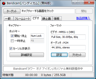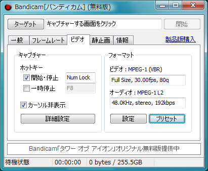 無料版としては他の録画ソフト(FrapsやDxtoryの評価版)と比較して無制限ではないものの録画時間が10分と実用範囲内である点(※Frapsは30秒、Dxtoryは無制限)、ロゴ表示がそれほど目立たない点をメリットと考え、選択肢の1つになるかと思います。