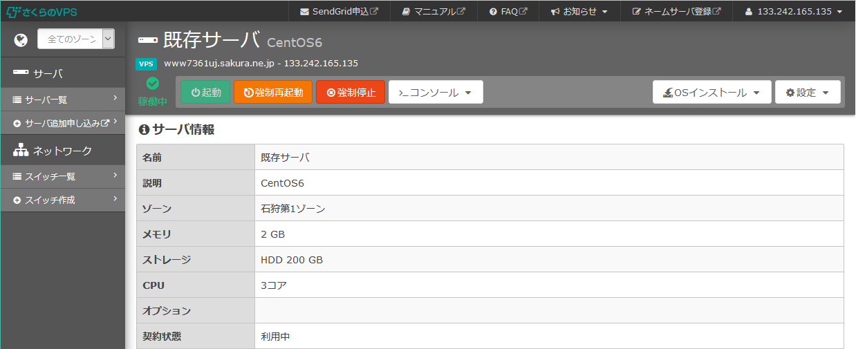さくらのVPSの場合は、新規サーバでも標準のCentOS 6がインストールされた状態です。