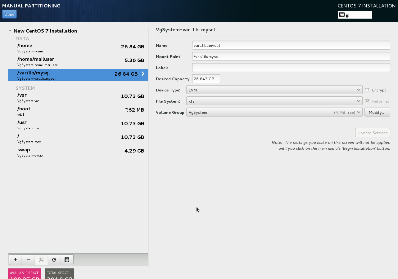 /var/lib/mysqlのようにミドルウェア用のパーティションを個別で用意しておくと、バージョンアップや障害時などに役立つことがあると思います。