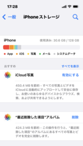 機種変更後のストレージサイズは使用済み:30.6GB/128GBでした。