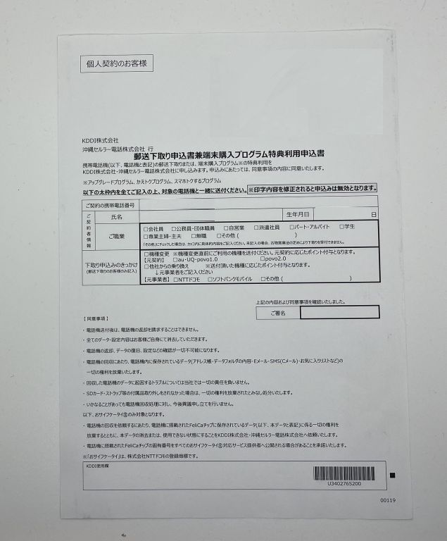 ここでの機種変更の申し込み区分は、前回とはことなりSIMカードの変更がなく継続して利用できないため「端末増設」ではなく「移動機変更」になります。そのためICカードが同梱されていました。