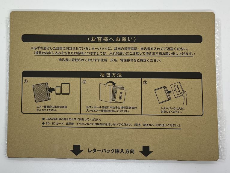 - ダンボール台紙に申込書と携帯電話機の入ったエアー緩衝袋を挟みます。