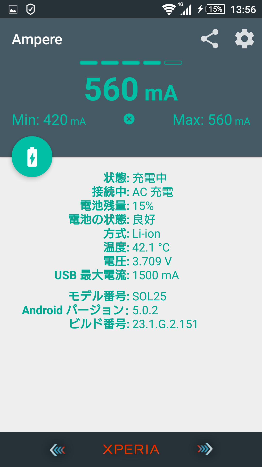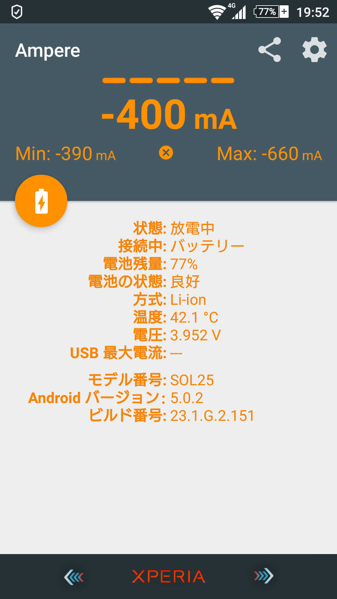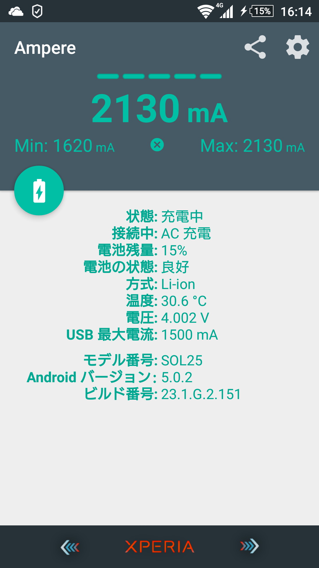 Xperia ZL2 SOL25の電池残量が15%程度の状態(充電をしてくださいの表示がでる)で計測しています。