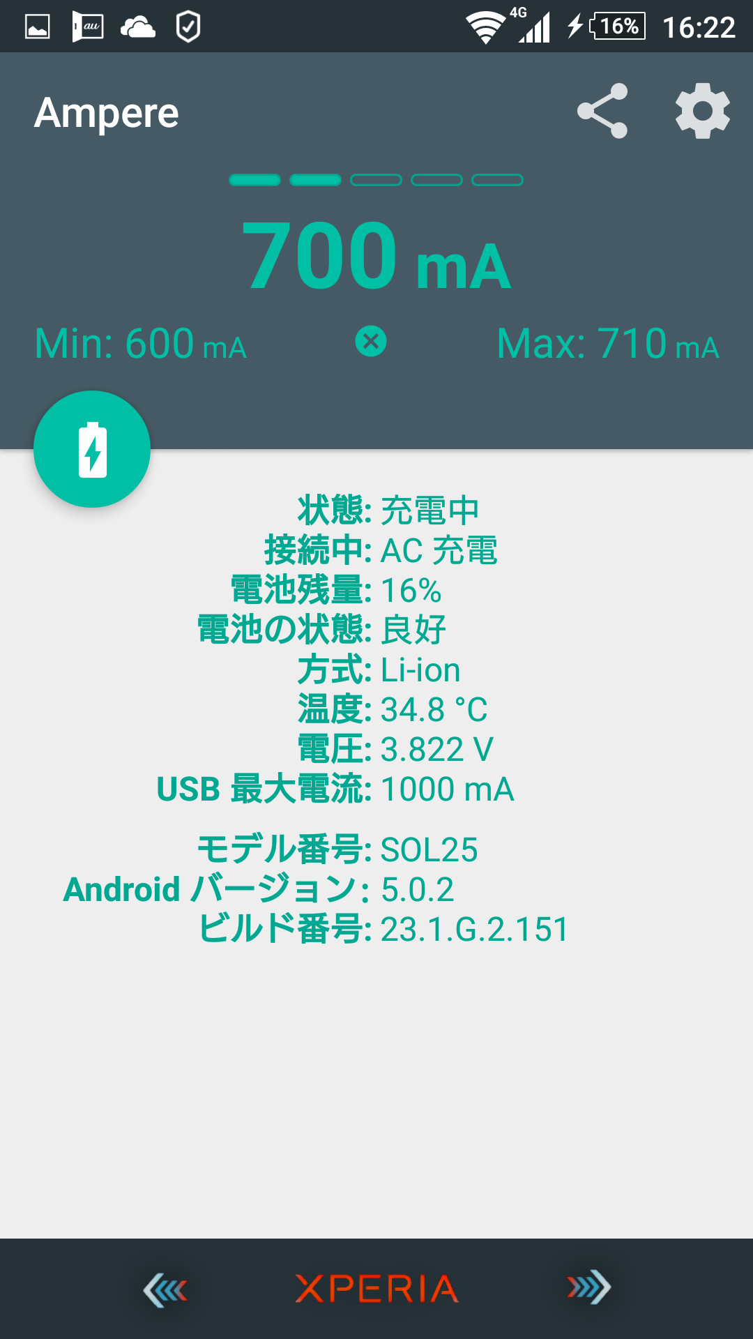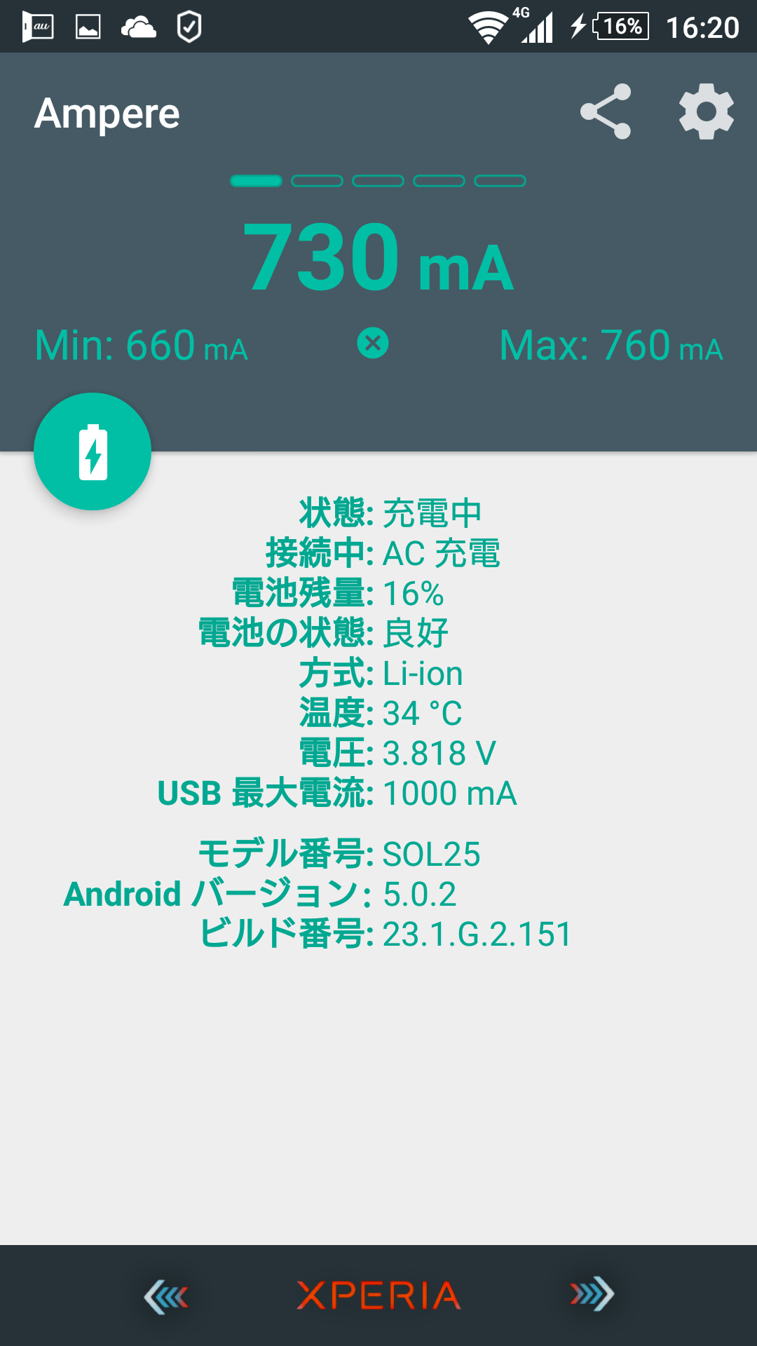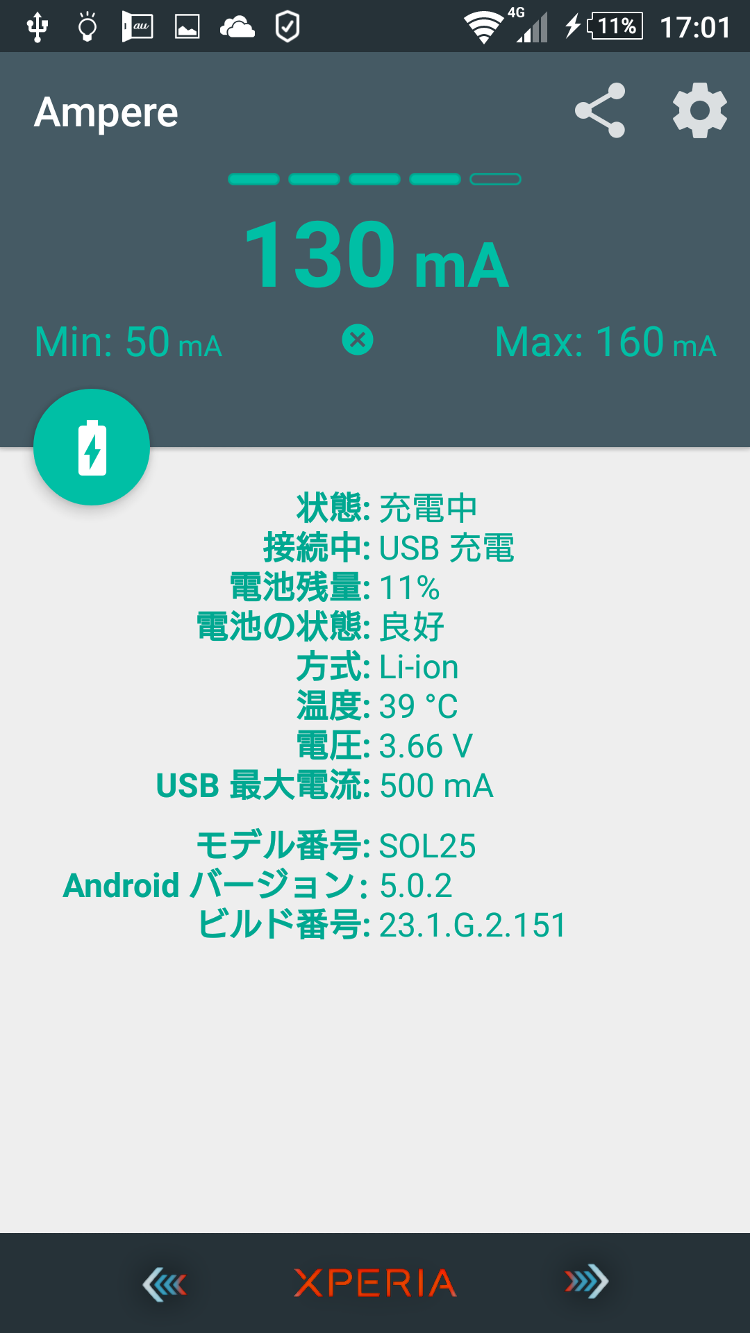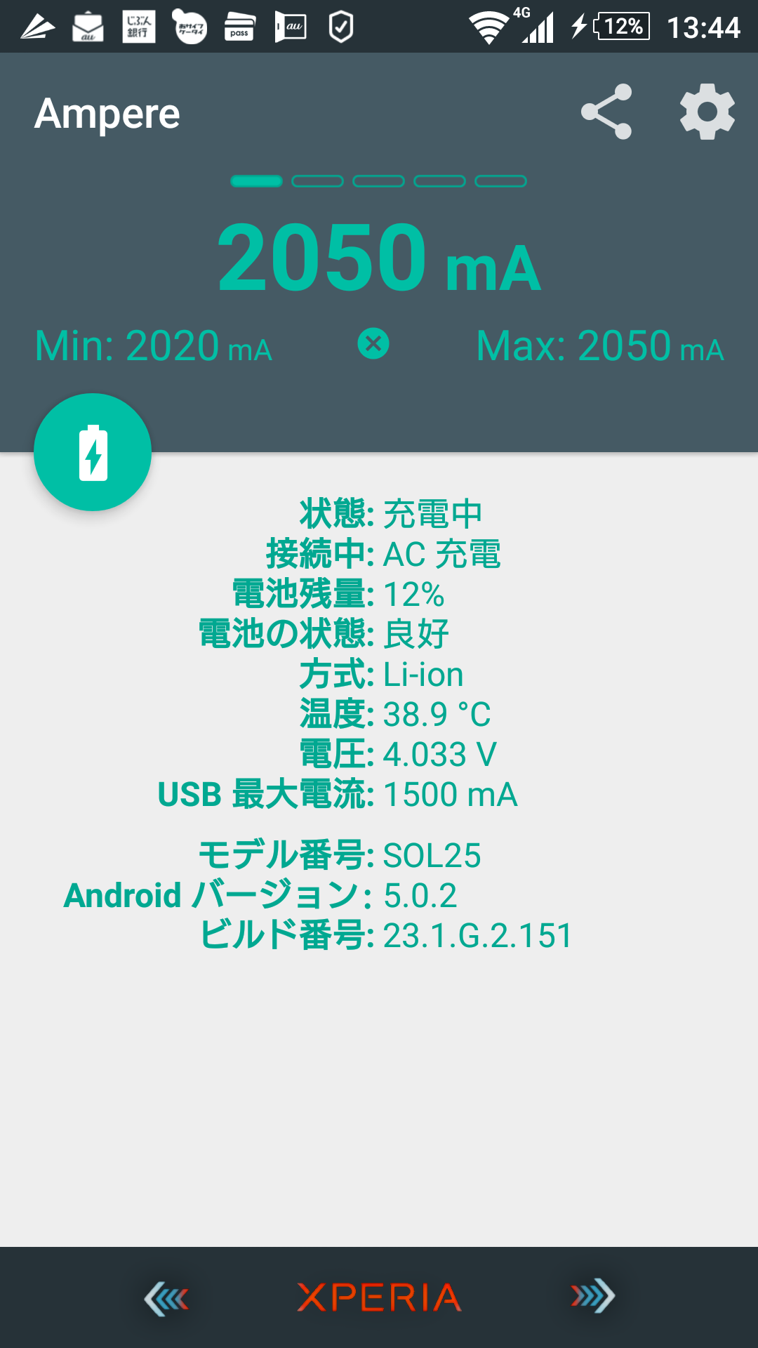 Xperia ZL2 SOL25の電池残量が15%程度の状態(充電をしてくださいの表示がでる)で計測しています。