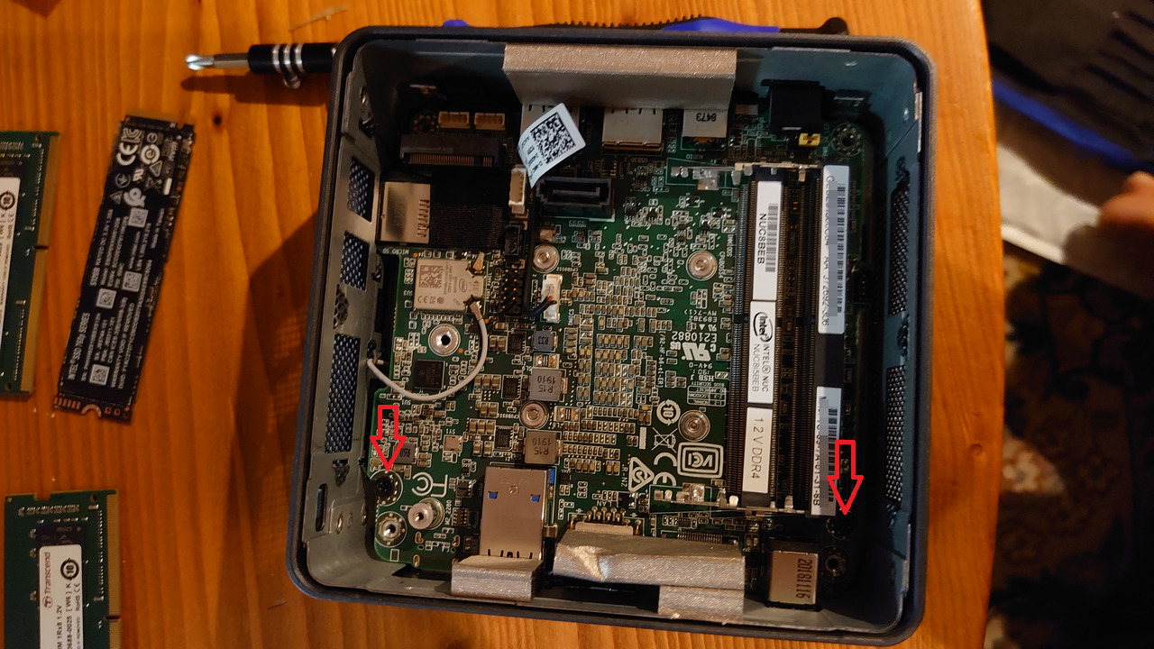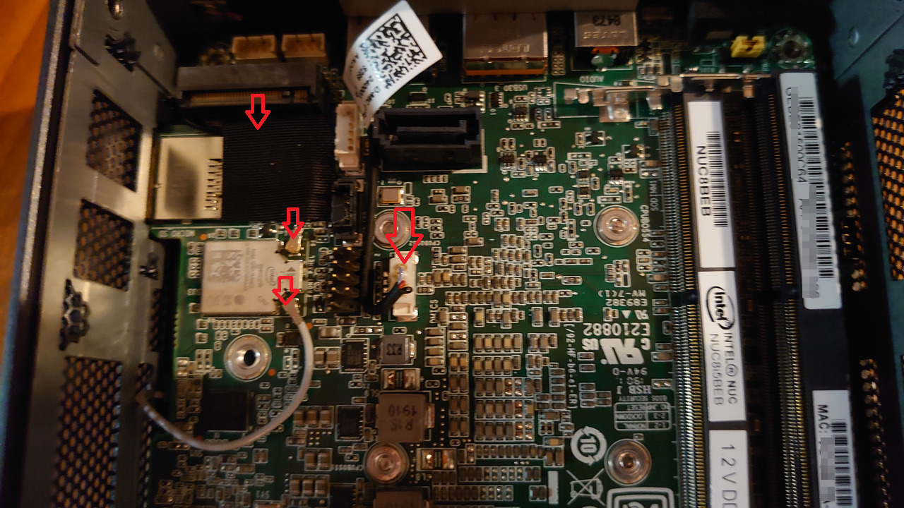 NUC8i5BEHはドライブを内蔵するためのベイが裏ブタに取り付けられているためSATAケーブルとその電源ケーブルをマザーボードから外す作業を行わないと裏ブタは外れません。電源ケーブルはコネクター部が断線しやすいので丁寧に扱ってください。