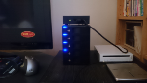 内臓HDDと外付けHDDとで別々に記憶域プールを作成し、外付けHDD(5ドライブケース)を別PCへそのまま接続して利用することを想定しています。
