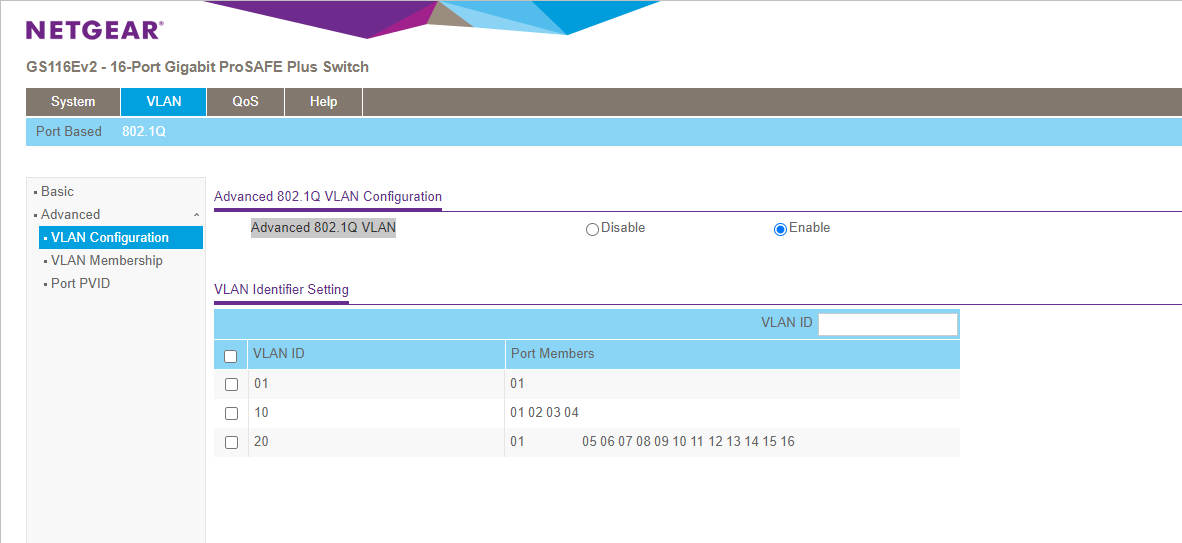 GS116Ev2のAdvanced 802.1Q VLANです。