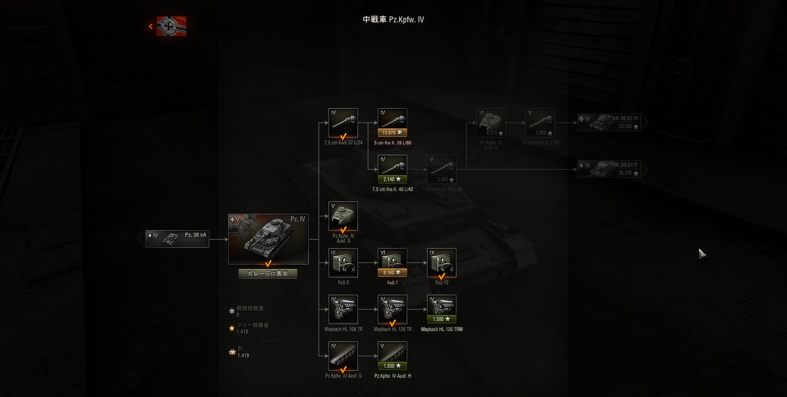 その経験値をフリー経験値に変換して、Pz.38nAの技術系統にあった中戦車Pz.IVを得ることができました。