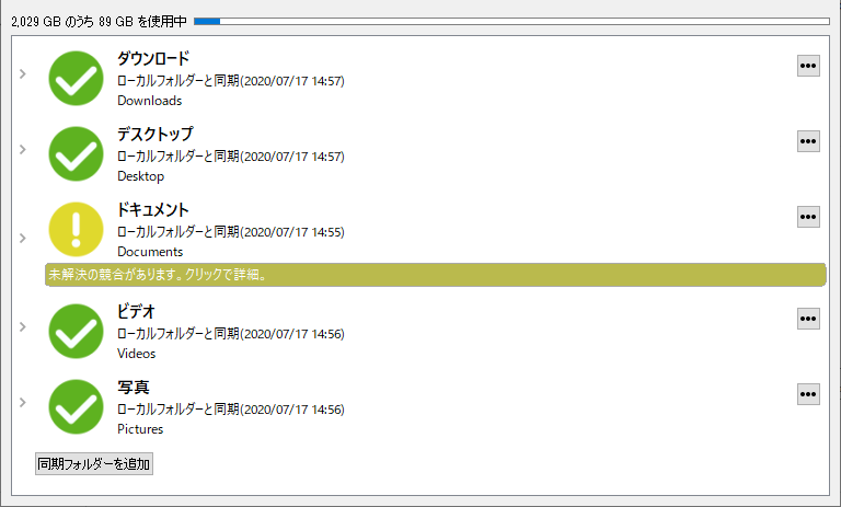 ※緑の丸のレ点がついているフォルダーが同期フォルダーです。