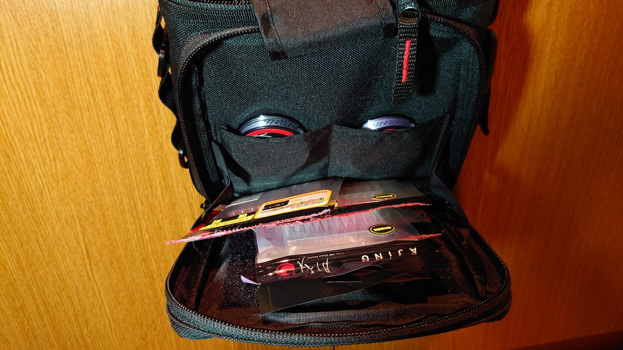 写真は、フロントポケットにワームをパッケージのまま収納した例です。