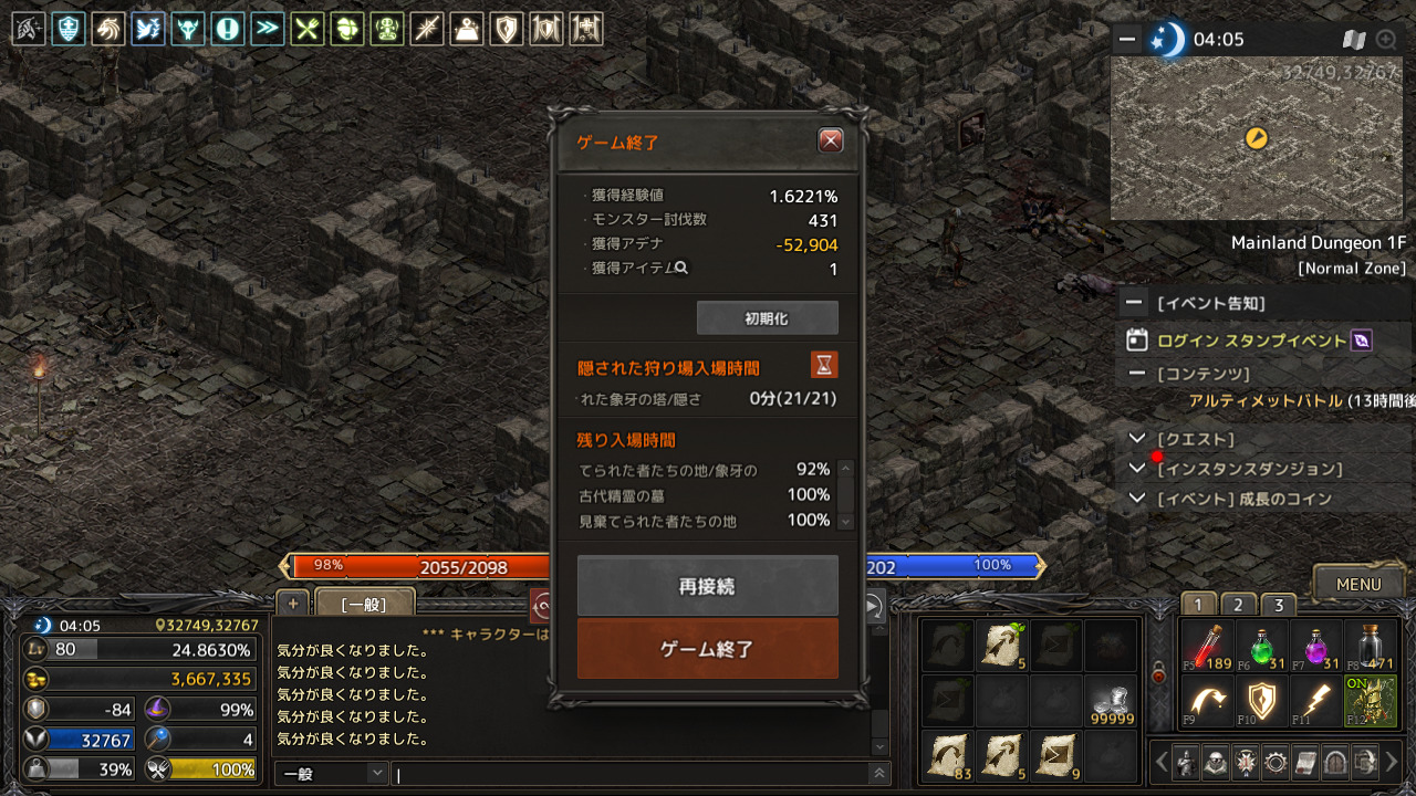 アデナ、アイテム、LV、HP/MP、アインハザードの祝福の状態などを確認できません。