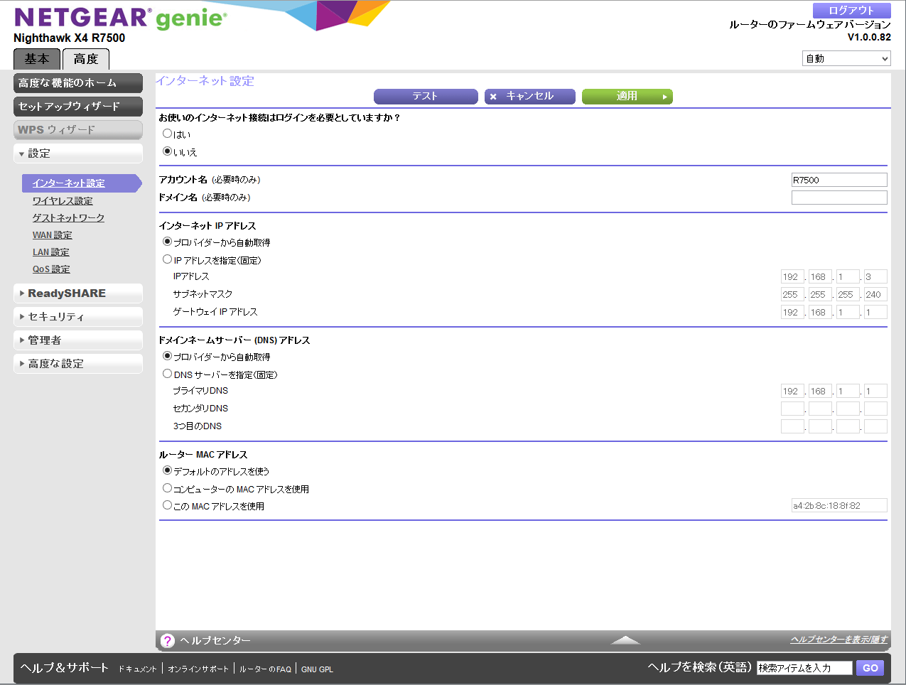 DNSサーバアドレスは設定項目がありませんが、本機のLAN側IPアドレスが使われています。
