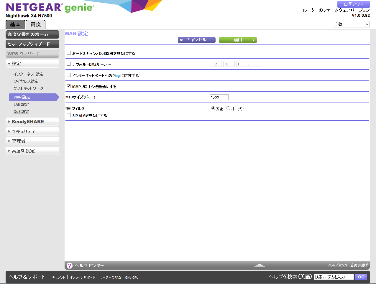 インターネット側からのPing応答やDoS攻撃対策などセキュリティに関する設定が含まれています。