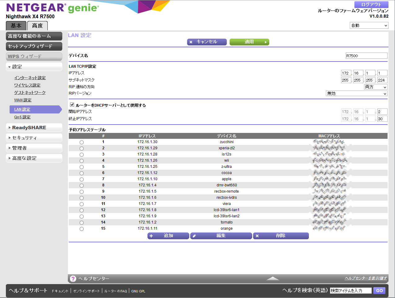 本機のIPアドレスは10.0.0.1、サブネットマスクが255.255.255.0になっているため、LANポートに接続した機器のIPアドレスは10.0.0.2~10.0.0.254までの253台分から順番に割り振られます。