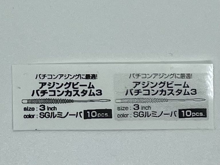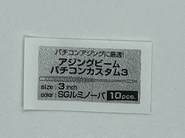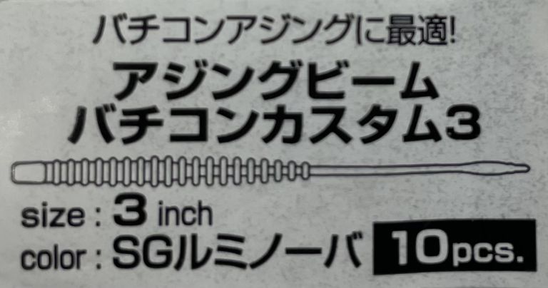 被写体は「ダイワ 月下美人 アジングビームバチコンカスタム 3インチ SGルミノーバ」のパッケージにあるラベル部分です。