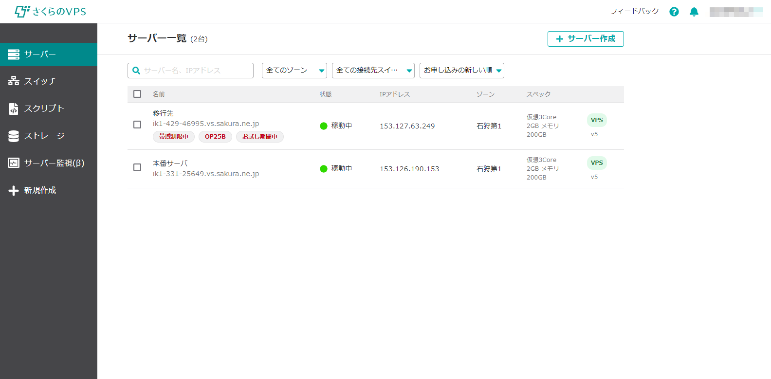 認証が成功するとさくらのVPS サーバ一覧画面が表示されます。
