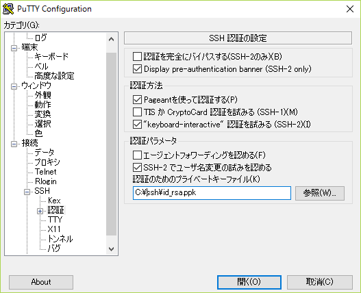 ※PuTTYの設定についてはSSHクライアントの設定で記載します。