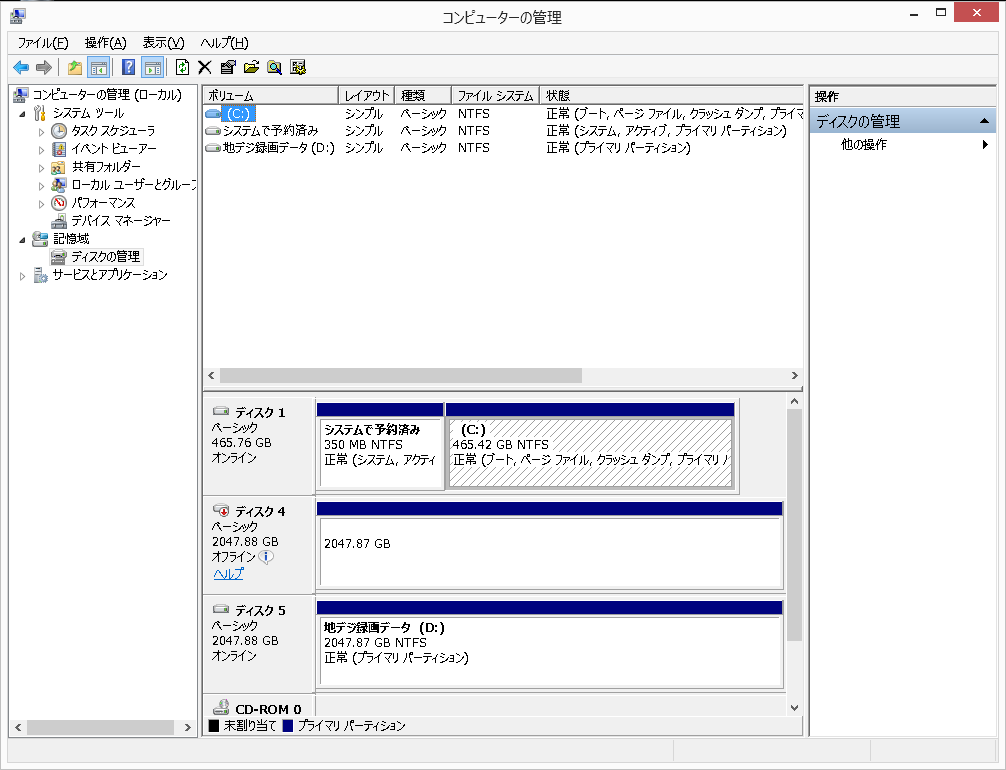 ディスクの管理画面では2つのスペースがそれぞれ2TBずつになっていることが確認できます。