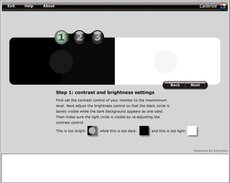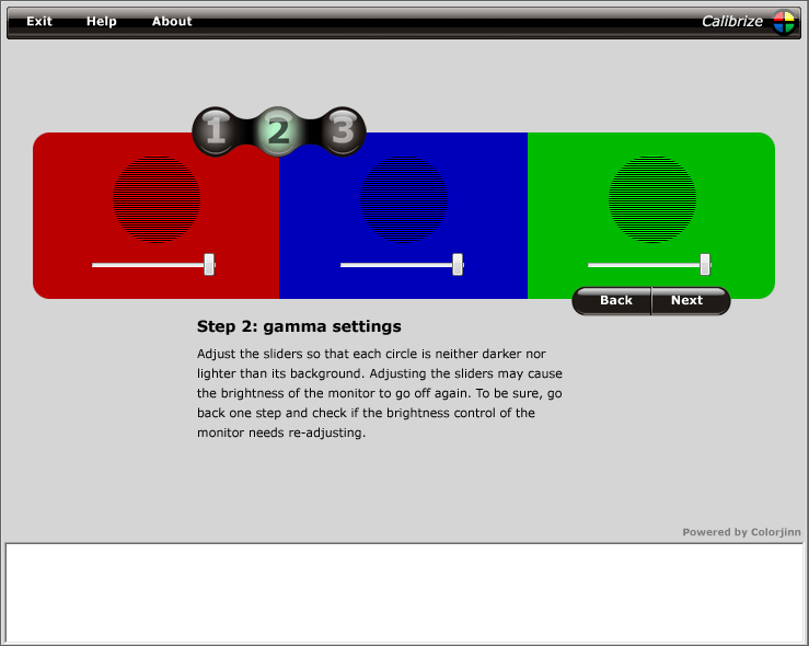 • ガンマ値の設定では、Calibrizeのシークバーで各赤青緑の円が目立たないように調節を行い設定値を保存します。