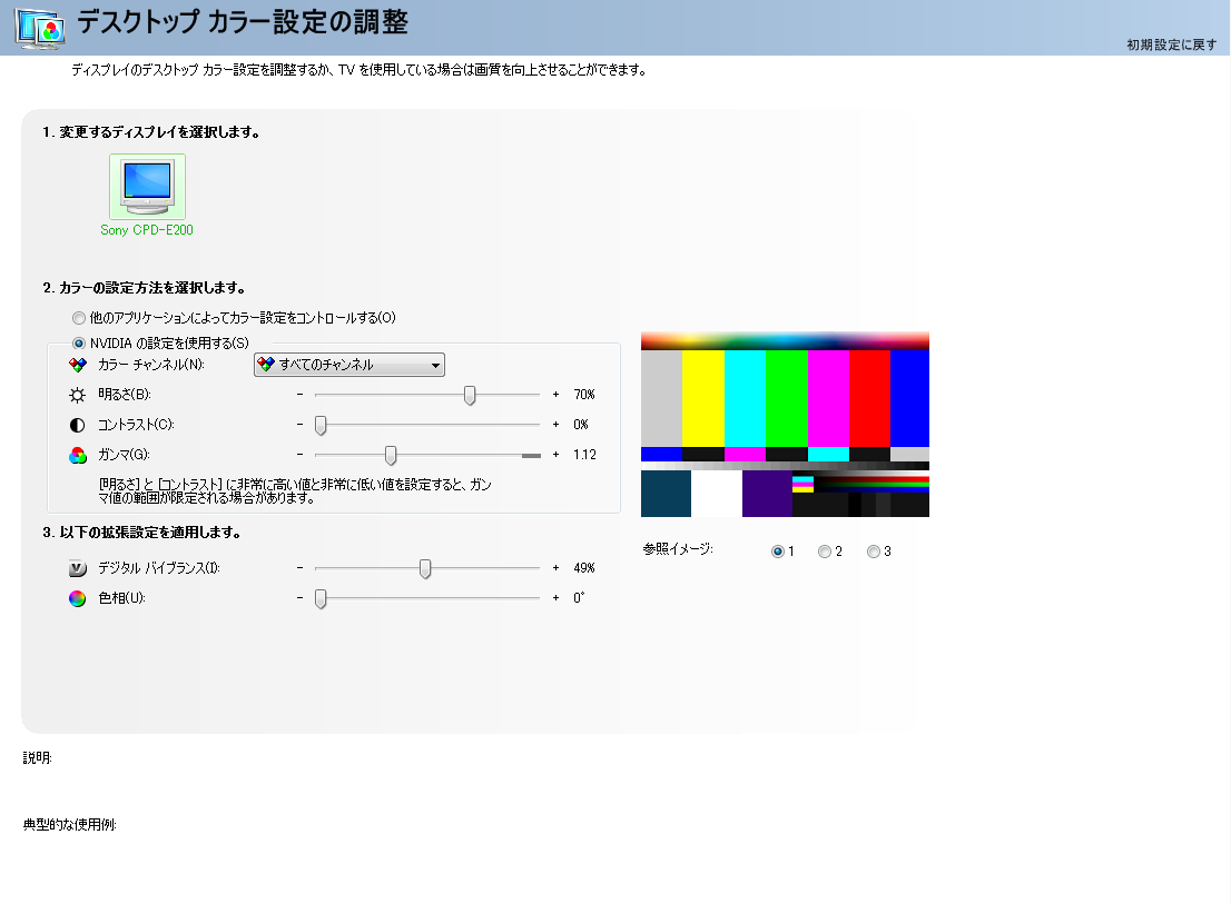 NVIDIAコントロールパネルで行う方法では、PCを再起動するたびに設定をしなくてはならないようなので、モニタの設定とCalibrizeでのみ設定するようにしました。
