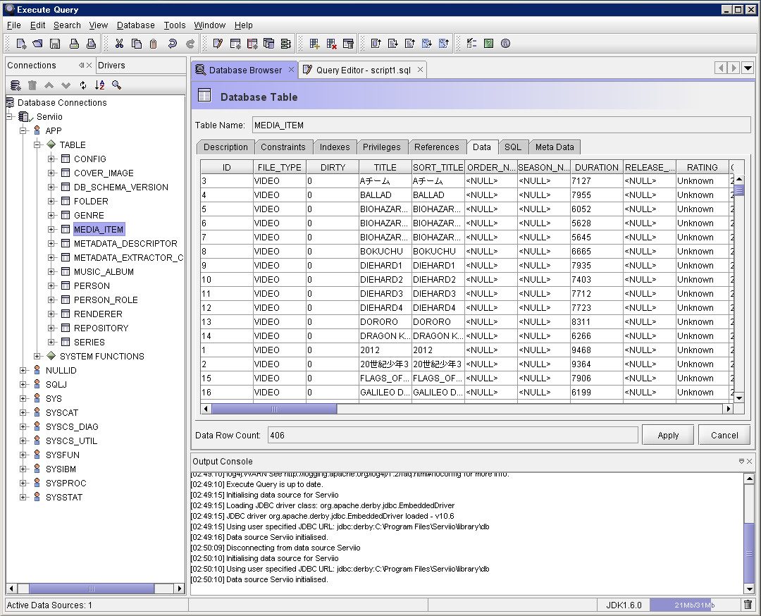 ※Serviioで使われているApache Derbyは、1セッションの接続しかできないためServiioサービスを停止しておきます。