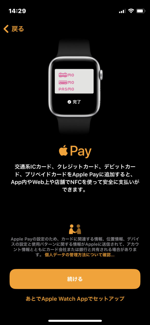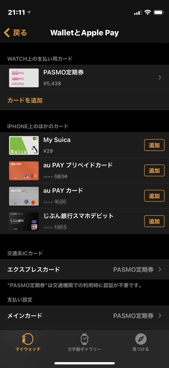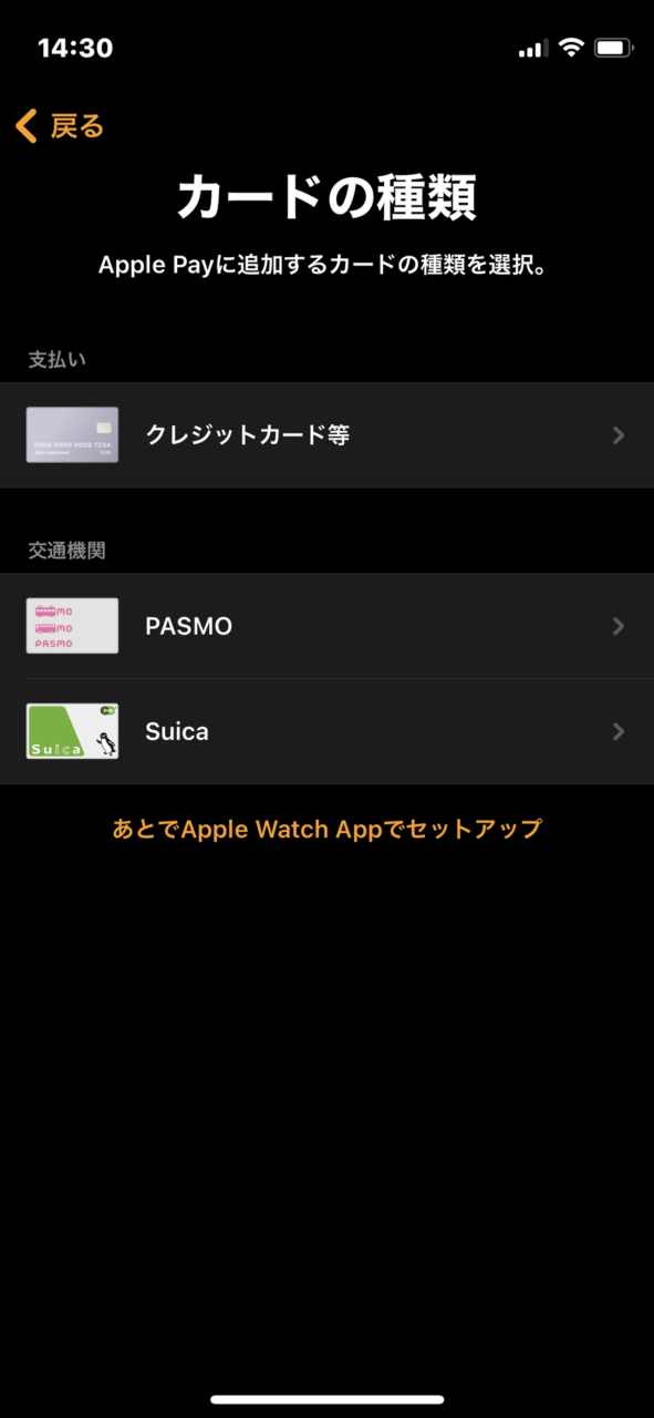 また、Apple Watchでチャージするのであれば、支払い用カードもいっしょに追加が必要です。