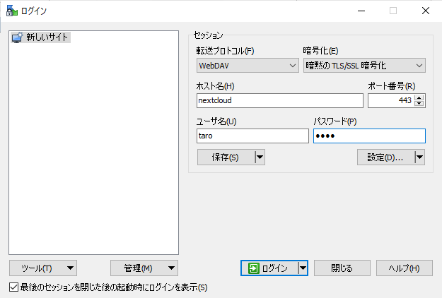 ホスティングサービスのサーバへファイル転送するときに使用しているWinSCPで、NextCloudのWebDAV接続を行いました。
