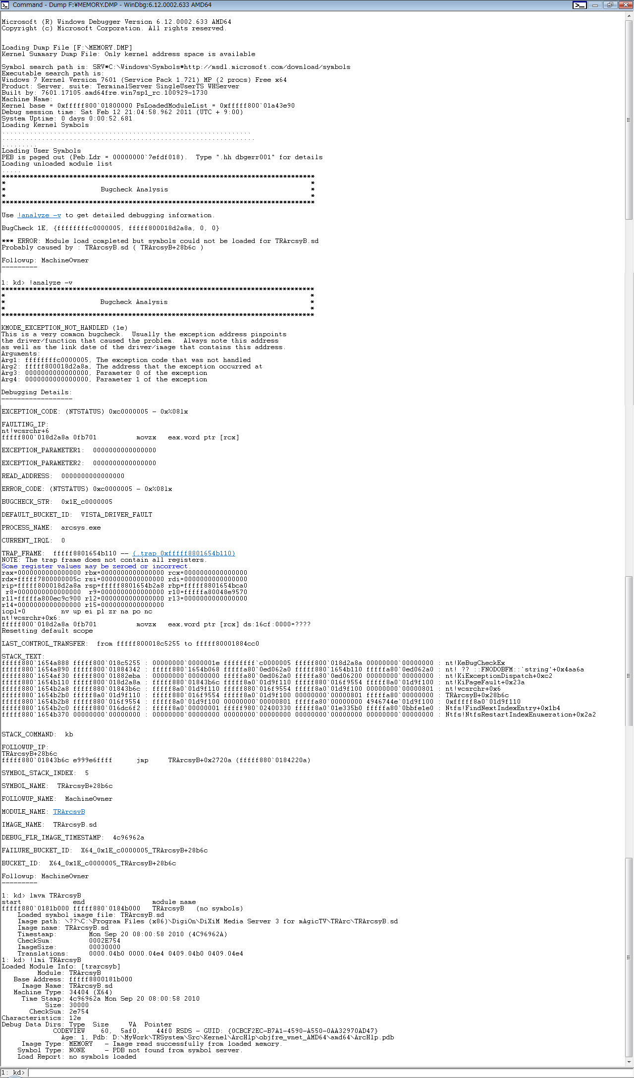 以下のように、プロセス名:arcsys.exe(TRArcProtect)、モジュール名:TRArcsvB、イメージ名:TRArcsvB.sdでエラーが発生しているようです。