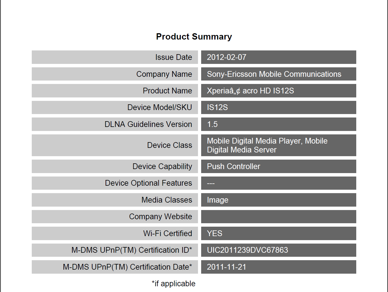 Sony Mobile Cominucationsのサイト情報にはDLNA認定ロゴがありましたので、DLNAサイトで検索してみました。